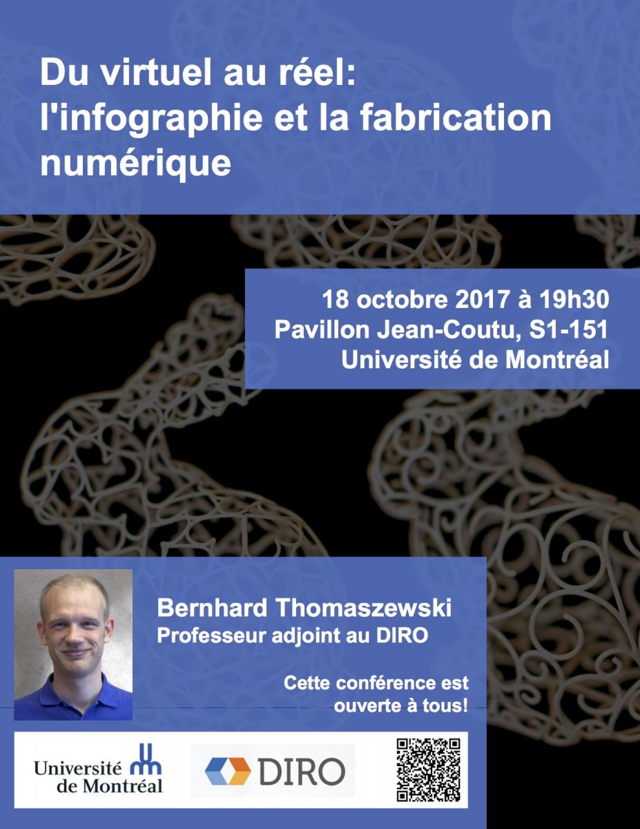 Cette présentation expliquera comment l'infographie peut contribuer à une nouvelle génération d'outils de conception adaptés à la fabrication numérique. L’idée fondamentale sous-jacente de ce paradigme de conception est de supprimer les obstacles à la créativité, en automatisant les parties techniquement difficiles du processus de conception. Sur le plan technique, cette approche repose sur trois éléments clés